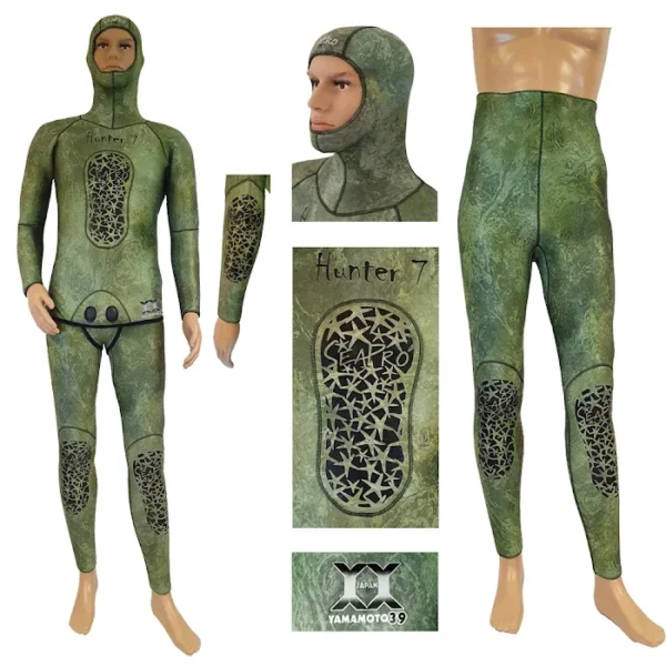 Stoffets kamuflasjemønster er spesialdesignet for SeaPro i nært samarbeid med markedsledere innen harpunfiske for bruk i skandinaviske farvann. Den grønne fargen er spesielt valgt for å matche kamuflasjefargen til de skandinaviske spesialstyrkene. Yamamoto 39 Neoprene skiller seg ut med sin høye varmeisolasjon, motstand mot knusing, karakteristiske komfort og miljøvennlige struktur. Neoprenen er av den mest miljøvennlige typen. Ytteroverflaten er i Micro Polyester jersey, inneroverflaten er i Open Cell. Det ytre Micro Polyester jersey-stoffet er elastanforsterket for å gjøre det mest fleksibelt og slitesterkt. Puteforsterkning i brystområdet som gjør det enkelt å lade harpuner. Kne- og albuebeskyttelse spesielt designet for SeaPro. Sikkert og slitesterkt spennesystem. Ergonomisk snitt.